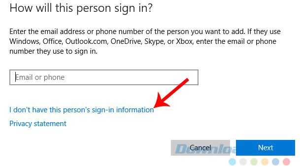 Bước 3: Nhấp vào I don’t have this person’s sign-in information ở giao diện tiếp theo.