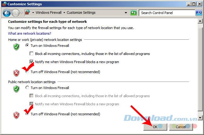 Bước 3: Tick vào Turn off Windows Firewall (not recommended) ở 2 mục: