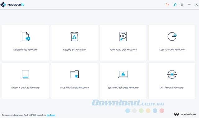 Trong menu chính của Recoverit thì bạn sẽ có các lựa chọn như sau:
