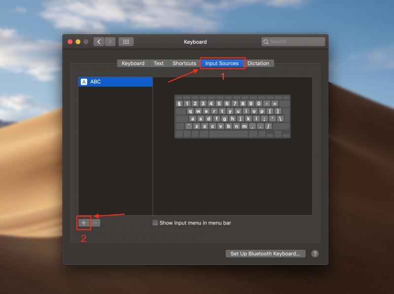 B3 : Trên cửa sổ Keyboard chọn Tab 'Input Sources' chọn dấu '+' (Như hình dưới) để thêm bộ gõ Tiếng Việt.