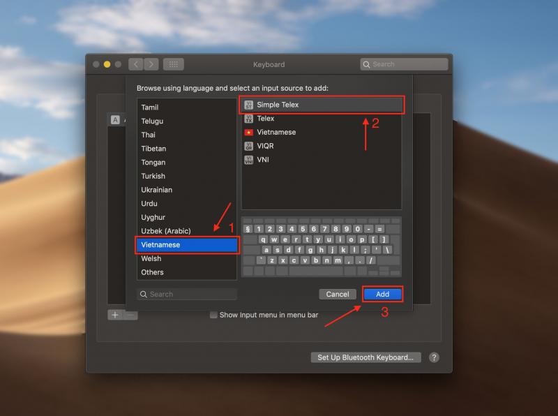 B4 : Lựa chọn ngôn ngữ 'Simple Text, Telex, Vietnamese, VIQR, VNI'. Chúng tôi lựa chọn 'Simple Telex' vì đây là bộ gõ cơ bản, sau đó lựa chọn 'Add' để thêm bộ gõ mới.
