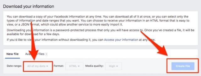 - Từ menu thả xuống, chọn Date range: All of my data và nhấp vào Create File.