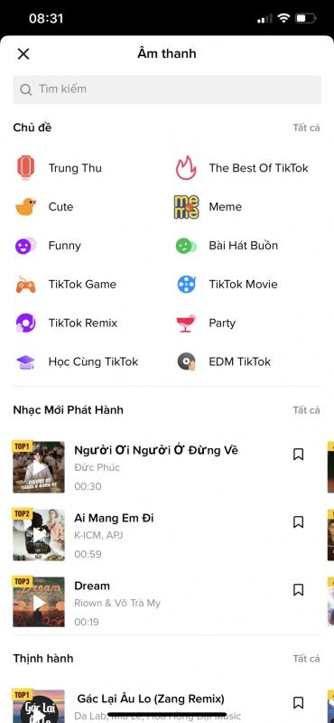 Tại giao diện Chọn nhạc bạn có thể chọn các bài hát theo ý thích bằng cách tìm kiếm theo tên bài hát hoặc xem: Bài hát thịnh hành, Xu hướng, Việt Nam, Hit, Nhạc hot. Ngoài ra các bản thu âm mang phong cách: Original, Party, Funny, Plot Twist, Kpop, Challge, Sport, Cute, Emotions, Anime đều sẽ rất hấp dẫn.
