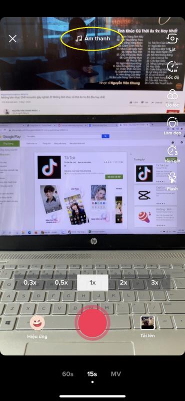 Sau khi thiết lập xong hãy nhấn chọn đến dấu cộng ở chính giữa màn hình, tiếp đến sẽ đến với giao diện quay video, tuy nhiên trước tiên hãy chọn nhạc cho video Tik Tok của bạn bằng cách nhấn chọn vào Chọn nhạc - phía trên cùng màn hình.