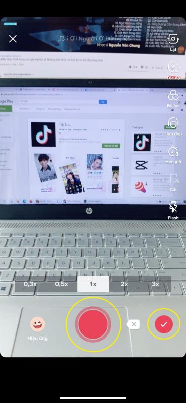 Chúng ta sẽ quay lại với giao diện quay video, lúc này chúng ta sẽ quay mặt hoặc bất cứ 1 thứ gì và nhún nhảy, biểu cảm phù hợp với đoạn nhạc chúng ta đã chọn ở trên bằng cách chạm vào nút đỏ ở giữa màn hình, khi muốn dừng lại cũng chạm lại vào nút này.