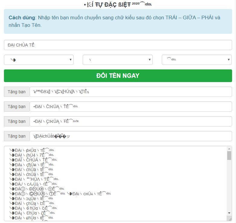 Bước 3: Sau khi hoàn tất nhập thông tin xong. Các bạn hãy tiến hành nhấn vào nút 'ĐỔI TÊN NGAY' và hệ thống sẽ tự động tạo cho chúng ta danh sách các kí tự đặc biệt đẹp nhất để đặt tên cho game như hình trên nhé.