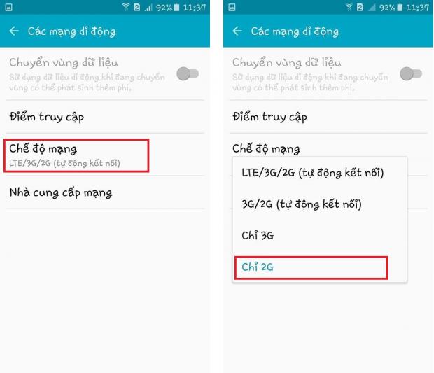 - Bạn vào Cài đặt > các mạng di động > chế độ mạng > chọn 2G (ở một số máy bạn chọn nhiều mạng hơn > các mạng di động).