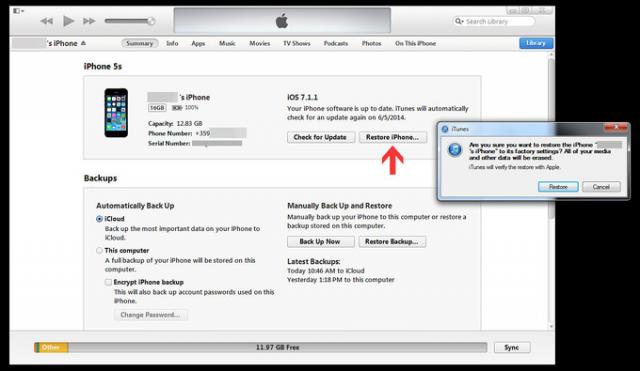 Trong trường hợp cả 2 cách trên không làm việc, bạn cần sao lưu dữ liệu vào thiết bị lưu trữ, kết nối thiết bị với máy tính qua iTunes, giữ nút nguồn và nút Home trong khoảng 6 giây. trong vòng vài giây, iTune sẽ thông báo cho bạn biết rằng nó đã phát hiện một chiếc iPhone hoặc iPad ở chế độ phục hồi, nhấn nút khôi phục và đợi phần mềm cài đặt iOS 7.1 trở lại thiết bị của bạn.