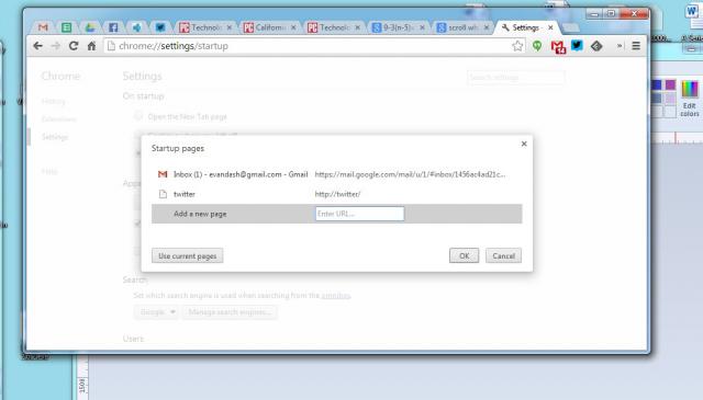 Bạn có thể thiết lập Chrome để mở các trang web tương tự mỗi lần bạn khởi động trình duyệt. Để làm vậy, hãy vào mục Settings, đi đến phần “On Startup” (hoặc gõ chrome://settings/startup trong hộp tìm kiếm) và click vào lựa chọn “Open a specific page or set of pages”. Tiếp theo đó là lựa chọn một link “Set pages”, cho phép bạn lựa chọn các trang web khi bắt đầu.