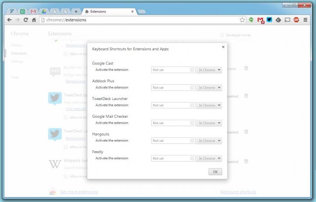Bạn có thể tự tạo phím ẩn cho phần Extensions (Mở rộng). Để làm vậy, hãy đi đến cửa sổ Extensions và bạn sẽ thấy 'Keyboard shortcuts” ở cuối cửa sổ. Hộp thoại này sẽ cho phép bạn tạo phím nóng để khởi động bất cứ phần mở rộng nào trong thư viện. Ví dụ, nếu bạn tải ứng dụng Google Hangout, bạn có thể tạo một phím nóng để nhanh chóng truy cập danh sách liên lạc.