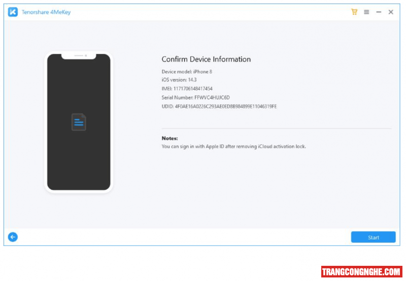 Sau khi bẻ khóa thành công sẽ xuất hiện cửa sổ hiển thị thông tin thiết bị. Và ở dưới cùng, bạn sẽ thấy tùy chọn bắt đầu xóa (Start). Sau khi bạn nhấp vào tùy chọn, quá trình mở khóa iCloud của iPad sẽ bắt đầu. Màn hình của bạn sẽ hiển thị tương tự như hình ảnh bên dưới.