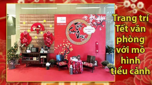 Trang trí tiểu cảnh ngày Tết ngày càng được nhiều người lựa chọn bởi mang đến hình ảnh rộn ràng ngày Tết, gần gũi và mang đậm bản sắc văn hóa dân tộc. Tiểu cảnh giúp văn phòng thêm không khí rộn ràng, tạo cảm giác hứng khởi làm việc cho nhân viên, không khí ấm áp. Những hình ảnh làm nên tiểu cảnh như lồng đèn, mai đào, bánh chưng, bánh tét, đòn gánh,... mang ý nghĩa như 1 lời chúc năm mới sung túc, đầy đủ.