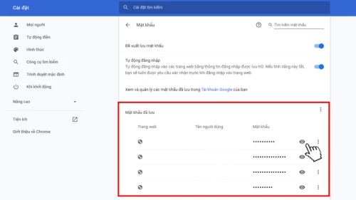Bước 3: Sau khi nhấn vào mục mật khẩu thì danh sách mật khẩu sẽ được hiển thị.