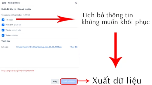 Bước 4: Trên màn hình xuất hiện 4 thông tin: tin nhắn, hình ảnh, tệp tin, video. Bạn cần xuất hết thì tích cả 4, tích bỏ thông tin không muốn khôi phục.