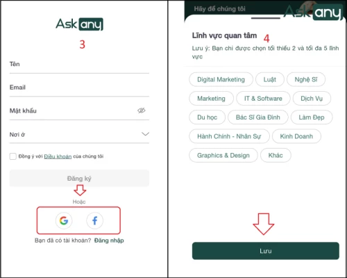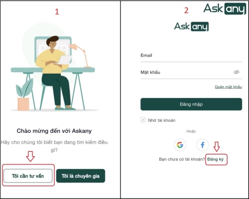 Bước 2: Tạo tài khoản Askany bằng cách nhấp vào dòng chữ “Tôi cần tư vấn” và chọn ô “Đăng ký”. Bạn có thể lựa chọn liên kết với Facebook hoặc tài khoản Google của mình. Tiếp đến chọn những lĩnh vực mà bạn quan tâm và bấm “Lưu”