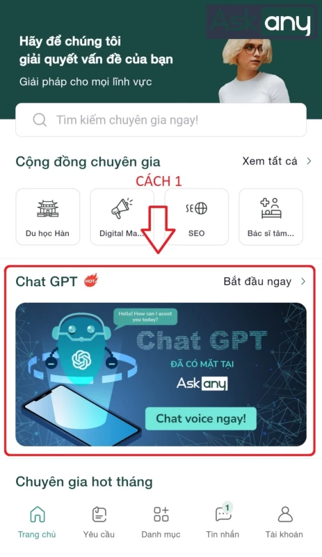Bước 3: Khi đăng ký tài khoản thành công, bạn sẽ được đưa đến trang chủ của ứng dụng. Tại đây, bạn sẽ nhìn thấy một banner với dòng chữ “chatGPT đã có mặt tại Askany”. Bấm vào dòng chữ trên banner này, bạn sẽ được chuyển thẳng đến ô chat cùng ChatGPT Plus