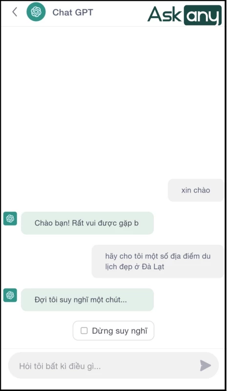 Do đó, chúng tôi giới thiệu đến bạn một cách tạo tài khoản chatgpt plus miễn phí đầu tiên tại Việt Nam, hiệu quả hơn mà không cần tốn kém bất kỳ chi phí nào. Thay vì trước đó, bạn phải mất hàng giờ để tìm cách đăng ký chat gpt, giờ đây bạn chỉ mất 30 giây để tạo tài khoản Askany là đã có thể sử dụng ChatGPT plus một cách nhanh chóng. Do Askany đã tích hợp ChatGPT plus phiên bản có trả phí của Mỹ vào ứng dụng của mình. Vì vậy, phiên bản này sẽ chạy mượt mà hơn, câu trả lời chính xác hơn hẳn bản Gpt thường mà bạn đang sử dụng. Dưới đây là một số bước hướng dẫn tạo tài khoản và sử dụng ChatGPT trên ứng dụng Askany chỉ mất ít giây: