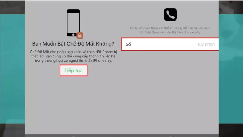 Bước 4: Ở giao diện “ chế độ mất”, hệ thống sẽ hỏi bạn muốn bật chế độ mất không?. Bạn lựa chọn “ tiếp tục” và nhập số điện thoại cá nhân.