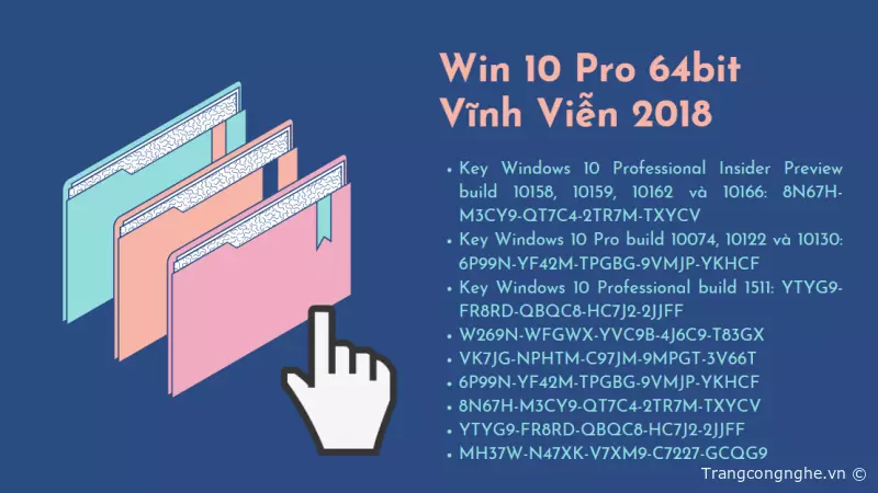 Key Win 10 là một chuỗi ký tự gồm 25 ký tự khác nhau được phát hành bởi Microsoft để người dùng có thể kích hoạt bản quyền Windows 10 trên máy tính của mình. Tuy nhiên, để sở hữu được key Win 10 Pro 20H2, 21H1 hay các phiên bản khác như Key Win 10 Pro Education 2022,... thì chúng ta phải mua. Tuy nhiên, việc mua bản quyền Key Win 10 Pro có thể gây khó khăn cho những người không có điều kiện kinh tế. Trong bài viết này, trangcongnghe.vn sẽ giới thiệu các bạn các key win 10 pro 64bit vĩnh viễn 2018 miễn phí.