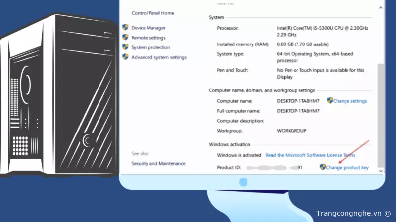 Bước 2: Tại mục “Windows Activation” > Click chọn vào link “Change product key” > Xuất hiện cửa sổ “User Account Control” bạn hãy click chọn “Yes” để xác nhận.