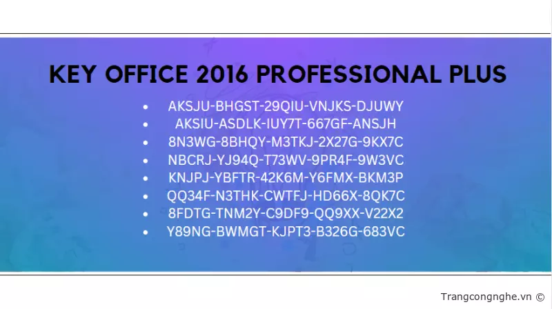 Nếu bạn đang cần mua key office 2016 chính hãng của Microsoft nhưng không muốn bỏ ra quá nhiều chi phí, thì Trangcongnghe.vn có thể giúp bạn. Dưới đây là danh sách các Product Key miễn phí dành cho Office 2016 Standard, Office 2016 License Key Home And Student, Office 2016 Product Key Home Business mới nhất năm 2023.