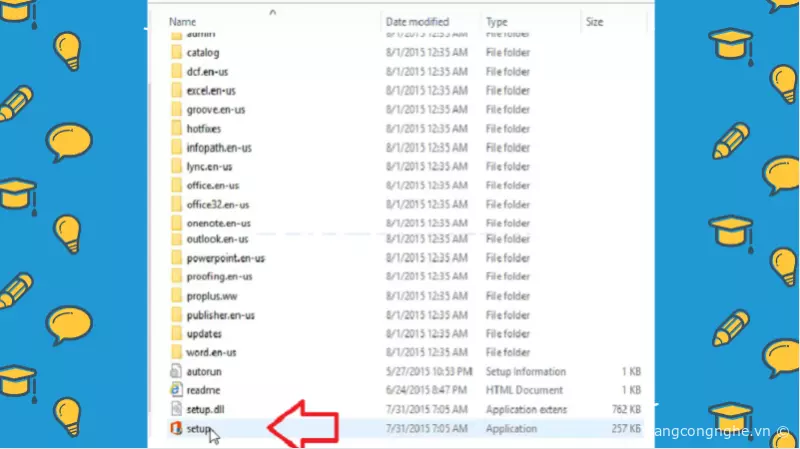 Bước 3: Lúc này sẽ có rất nhiều thư mục và tệp tin khác nhau hiện ra. Kéo xuống tìm file Setup, nháy đúp chuột để khởi chạy tệp tin.