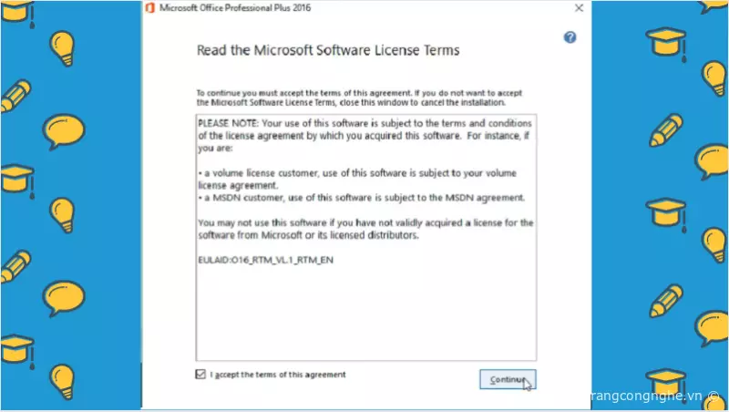 Bước 4: Cửa sổ Microsoft Office Professional Plus 2016 sẽ hiện lên, bạn chỉ cần nhấn chọn vào ô I accept the term of this agreement, sau đó chọn continue.