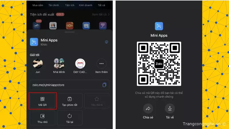 Bước 5: Bạn có thể chia sẻ mã QR mini app của mình bằng cách nhấn vào biểu tượng “Chia sẻ” hoặc “Tải xuống” ở dạng hình ảnh.