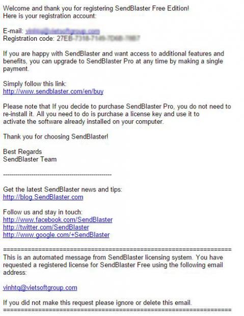 Bạn chờ khoảng 5-10 để hệ thống xử lý và bạn sẽ nhận được 1 Email trả lời từ Sendblaster kèm theo thông tin Registration code. Thật đơn giản phải không !