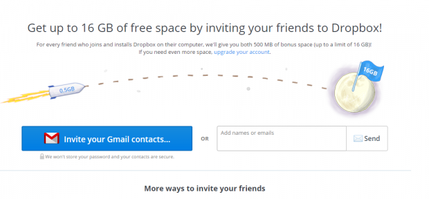 với mỗi tài khoản được tạo từ liên kết giới thiệu do bạn cung cấp thì bạn sẽ nhận được 500MB. Theo cách này, Dropbox sẽ cung cấp tối đa là 16GB dung lượng miễn phí.