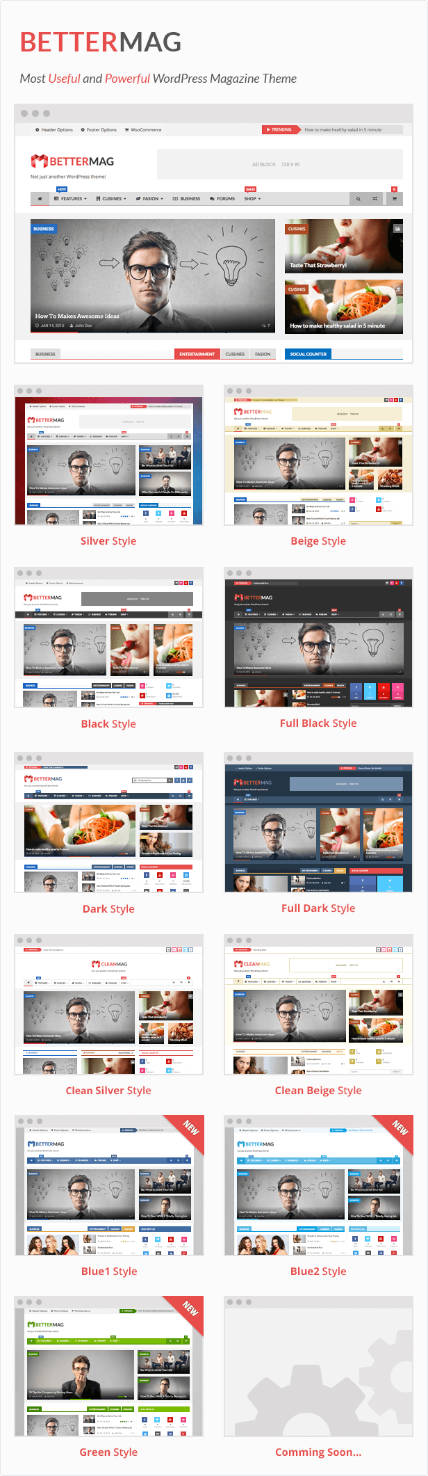 Giao diện được thiết kế khá đơn giản, tích hợp công nghệ HTML5/CSS3 tương thích với mọi loại thiết bị như Tablet, Smartphone, PC, Laptop... BetterMag mới được cập hơn hơn 11 giao diện với đủ màu sắc phù hợp cho các bạn có ý định thiết kế website tin tức, thiết kế website cá nhân. Đặc biệt BetterMag cũng tích hợp cả Module Woocommerce thuận tiện cho các bạn có nhu cầu muốn mở Shop ngay trên giao diên này.