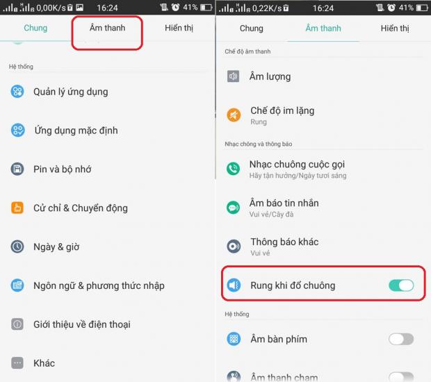 Đôi khi có những cuộc gọi hay tin nhắn đên nhưng smartphone của bạn không rung thông báo dù đã thiết lập trước, làm cho bạn bỏ lỡ rất nhiều cuộc gọi quan trọng. Lỗi này có thể là do khi bạn cài những ứng dụng khác đã làm thay đổi thiết lập rung của máy, khiến cho máy bạn gặp phải tình trạng trên. Vì vậy, muốn khắc phục điều này, người dùng nên thiết lập lại cài đặt rung của thiết bị bằng cách vào Cài đặt > Âm thanh và Rung > Sau đó bật Rung khi đổ chuông.