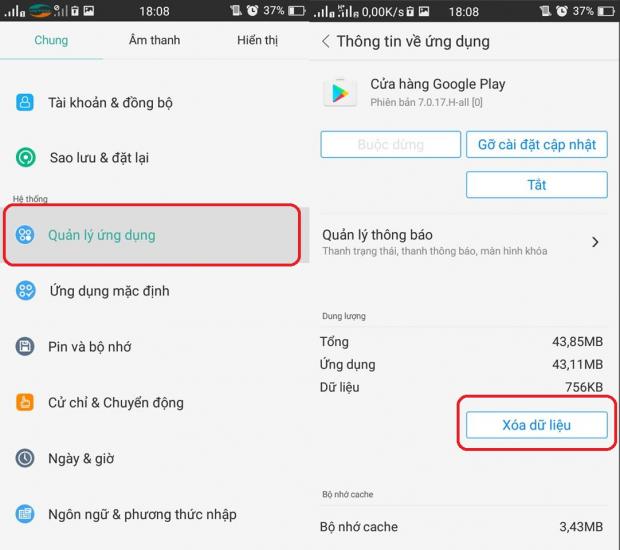 - Các cách trên vẫn chưa khắc phục được vấn đề thì bạn nên truy cập vào Cài đặt > Ứng dụng. Sau đó tìm đến CH Play và chọn Xoá Dữ liệu.