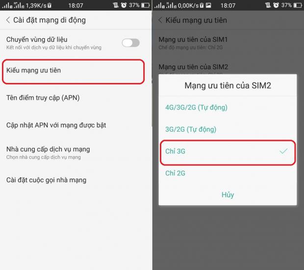 Lỗi này có thể lài do bạn đã chỉnh chế độ mạng là 2G nên mới xảy ra tình trạng trên. Để khắc phục, bạn truy cập vào Cài đặt > Mạng di động > Kiểu mạng ưu tiên và chọn Chỉ 3G là xong.