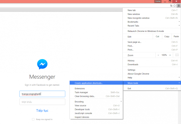 - Nhấn vào menu của Chrome > chọn More Tools > Create application shortcut...