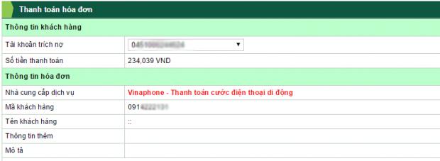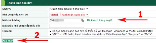 Bước này các bạn cần phải thật cẩn thận trong việc nhập thông tin/dịch vụ cần thanh toán. Loại hình dịch vụ bạn cần thanh toán (Mỗi loại hình dịch vụ được Vietcombank hỗ trợ đều có mã sản phẩm dịch vụ riêng) cần phải nhập chính xác.