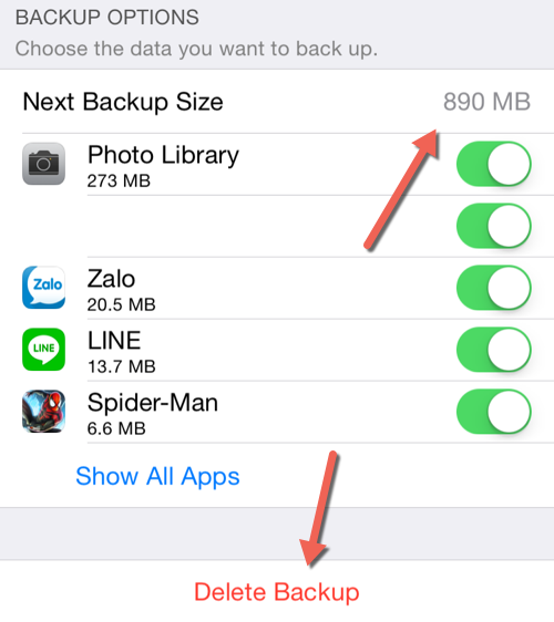 Bước 6: Như bạn có thể thấy, kích thước của các tập tin sao lưu là khá lớn. Do đó, nếu bạn thường xuyên sao lưu bằng cách sử dụng iTunes, việc sao lưu trực tuyến này thực sự là không cần thiết. Vì vậy, hãy nhấn nút Backup Delete và xác nhận.