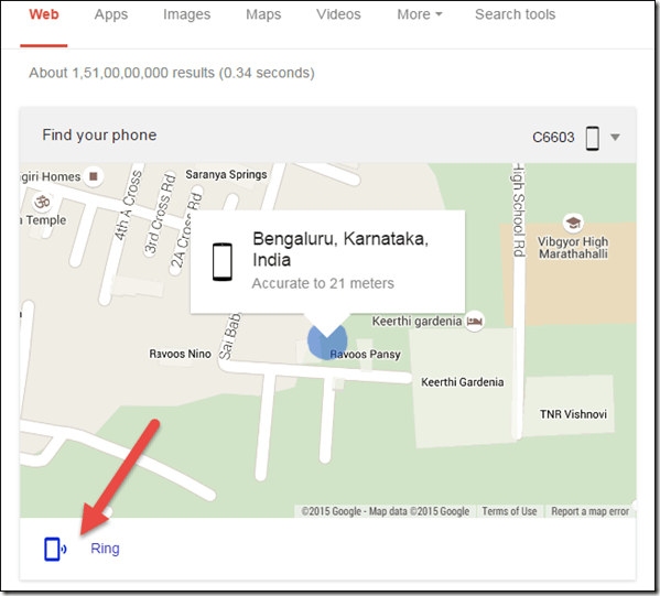 Bây giờ, khi bạn muốn tìm thấy điện thoại của mình, bạn hãy mở Google và gõ Find My Phone. Nếu bạn đã đăng nhập bằng các thông tin của bạn, bạn sẽ thấy một khung nhỏ trên trang với một bản đồ mini. Bản đồ sẽ xác định vị trí của điện thoại di động của bạn cũng như cung cấp cho bạn tùy chọn để gọi nó từ xa. Khi bạn nhấp vào nút Ring, điện thoại sẽ đổ chuông trong 5 phút. Tính năng này cũng cho phép bạn xóa dữ liệu từ xa trong trường hợp đánh mất điện thoại của mình.