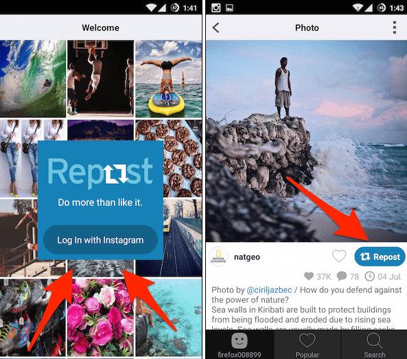 Repost for Instagram là ứng dụng miễn phí dành cho iPhone và Android. Sau khi tải ứng dụng về máy, bạn hãy mở ứng dụng và bắt đầu đăng nhập bằng tài khoản Instagram của mình. Tiếp đến, bạn sẽ thấy dòng thời gian hiển thị những hình ảnh được chia sẻ bởi những người mà bạn theo dõi. Với mỗi một bức ảnh, bạn sẽ thấy một nút Repost lớn. Lúc này, bạn hãy nhấn vào đây để chia sẻ.