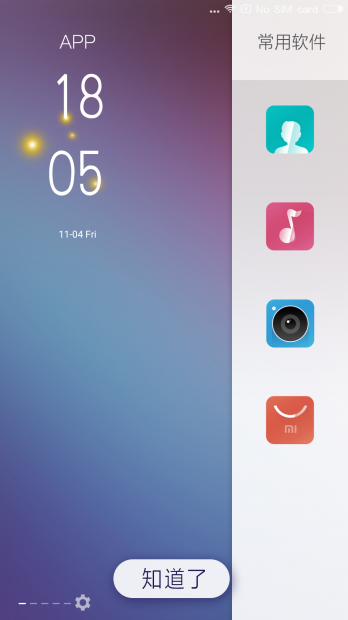 Tuy vậy, hạn chế lớn nhất của bộ theme này là tính năng Edge chỉ hoạt động khi ở Lockscreen. Chúng ta có hai lựa chọn vuốt chạm từ cạnh trái và cạnh phải. Cạnh trái sẽ chứa các lựa chọn thay đổi màu sắc, trang trí cho màn hình khóa. Cạnh phải chứ các giao diện khá tương đồng với các thiết bị cạnh cong của Samsung như các thẻ Danh Bạ, App yêu thích, Trình chơi nhạc, La Bàn, Đồng Hồ. Người dùng cũng có thế tùy biến các thẻ tab này nhưng giao diện sử dụng hoàn toàn bằng tiếng Trung Quốc, khá bất tiện.