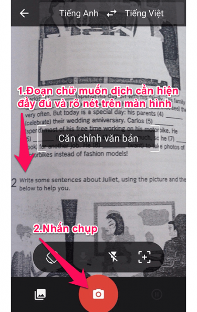 Bước 3: Hướng camera vào đoạn nội dung bạn cần dịch sau đó nhấn nút chụp. Lưu ý một số điều sau để kết quả dịch được chính xác nhất: