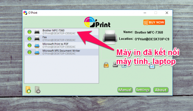 Bật ứng dụng O'Print trên máy tính, hãy kiểm tra máy in kết nối đã hiện trong danh sách hay chưa. Mặc định ứng dụng này sẽ được tự khởi động khi bật máy, vậy là xong, bạn không cần thao tác gì trên ứng dụng này nữa.