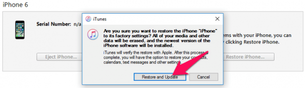 Chọn Restore and Update đợi cho iPhone đưa về nguyên bản và nâng cấp phiên bản mới nhất. Tốc độ thực hiện tùy vào tốc độ mạng nhà bạn.