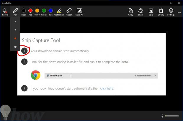 Click vào 'Pen' để lựa chọn kích thước của nó và sau đó chọn màu. Bây giờ, bạn có thể thêm bất kỳ loại hình dạng hoặc đánh dấu bất cứ điều gì trên màn hình của bạn.