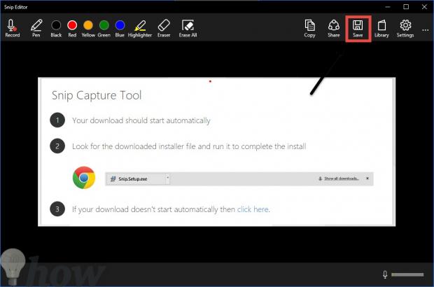 Để lưu một ảnh chụp màn hình đơn giản, hãy nhấp vào nút 'Save' ở góc trên cùng. Chọn vị trí cho ảnh chụp màn hình của bạn, tên và nhấp vào save một lần nữa để lưu nó.