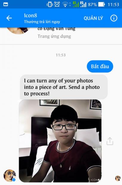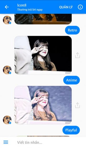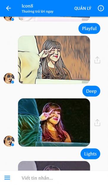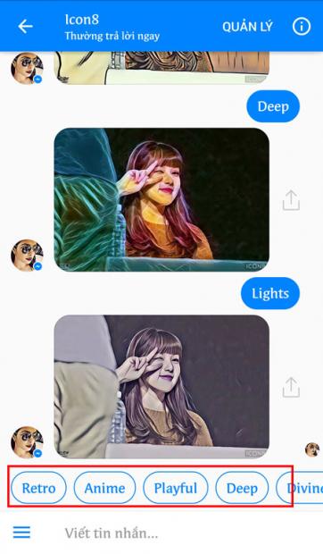 - Nếu muốn lựa chọn những bức ảnh khác để chỉnh sửa, bạn chỉ việc gửi ảnh qua khung chat và lựa chọn các kiểu ảnh mình muốn. Sau vài giây, ứng dụng sẽ nhanh chóng tự động gửi lại ảnh đã chỉnh sửa hiệu ứng cho bạn.