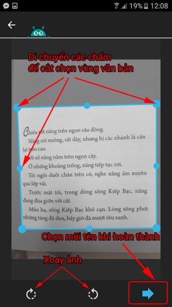 - Ứng dụng sẽ chuyển tiếp đến giao diện như hình. Bạn có thể chọn từng vùng văn bản bằng cách di chuyển các nút chấm tại khung cắt. Chọn biểu tượng mũi tên để tiếp tục.