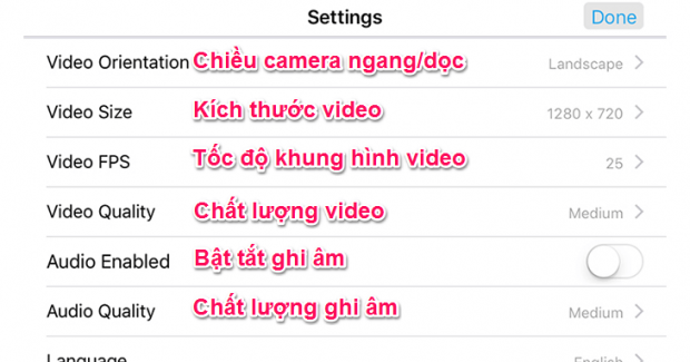Hoặc bạn có thể nhấn vào biểu tượng cài đặt để tinh chỉnh nâng cao một số thành phần camera. Tuy nhiên các thiết lập ở đây có thể ảnh hưởng rất lớn đến chất lượng và quá trinh truyền tải video, nếu có bất kì vấn đề gì hãy đưa các thiết lập này về mặc định.