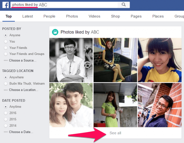 Cách thực hiện cực kì đơn giản. Đầu tiên bạn cần chuyển giao diện hiển thị của facebook sang tiếng anh (xem cách làm bên dưới). Sau đó, nhập vào khung tìm kiếm Photos liked by .... (ví dụ: tên facebook của bàn bè là Hiền Nguyễn thì bạn nhập vào Photos liked by Hiền Nguyễn).