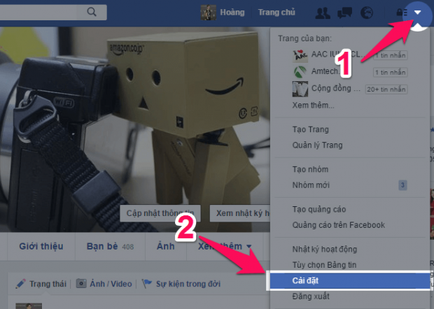 Đầu tiên bạn vào trang facebook. Chọn vào biểu tượng dấu xuống như trong hình và chọn cài đặt.